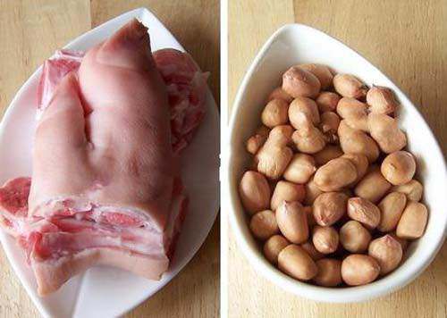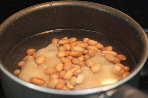 - Bỏ móng giò, lạc vào nồi, rồi bỏ gia vị vào, đảo đều cho ngấm gia vị chừng 5 phút và đổ ngập nước, hầm chừng 45 phút đến khi móng giò chín, lạc mềm thì bỏ mì chính, hành mùi vào.