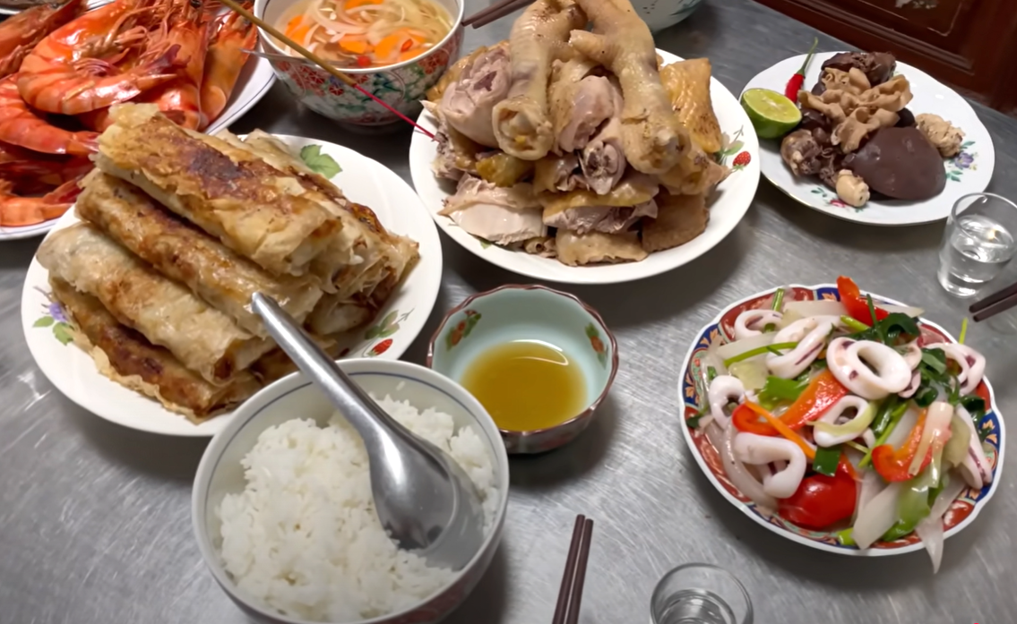 Theo quan sát của anh, trong các ngày cúng giỗ ở nhà vợ đều có những món quen thuộc như gà luộc, tôm luộc, nem rán và canh.