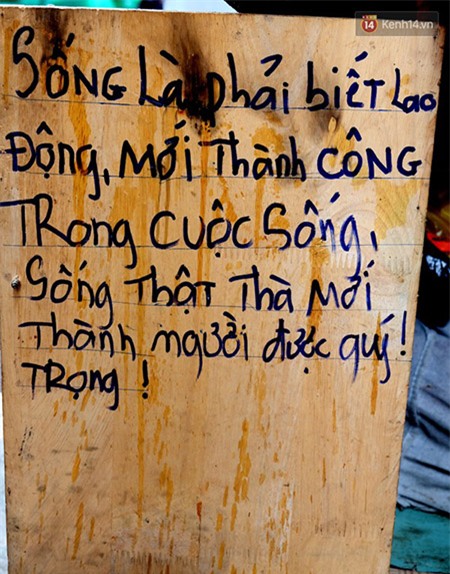 "Sống là phải biết lao động..." được người thầy của Cường nắn nót chép lên tấm bảng gỗ để Cường luôn ghi nhớ. |