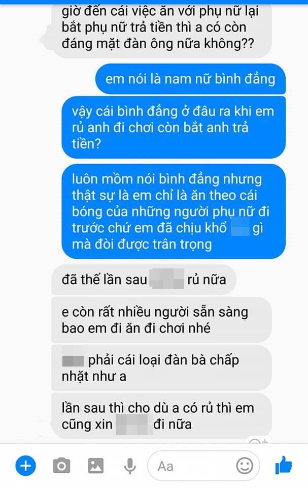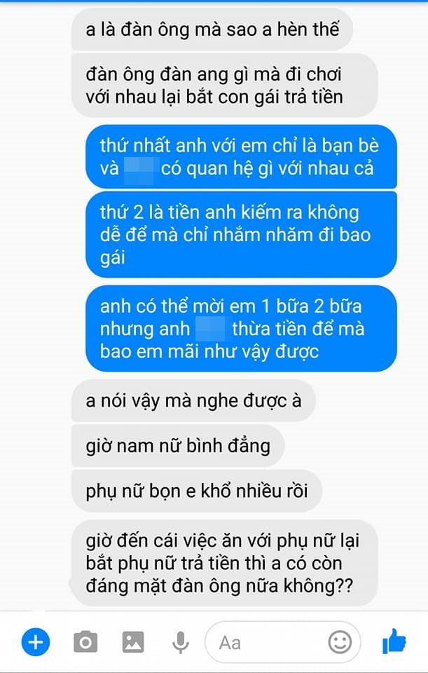 Đính kèm với câu chuyện này là hình ảnh tin nhắn trao đổi giữa hai người. Cô gái lập tức "phủ đầu" anh chàng: "Anh là đàn ông mà sao anh hèn thế? Đàn ông đàn ang gì mà đi chơi với nhau lại bắt con gái trả tiền?"