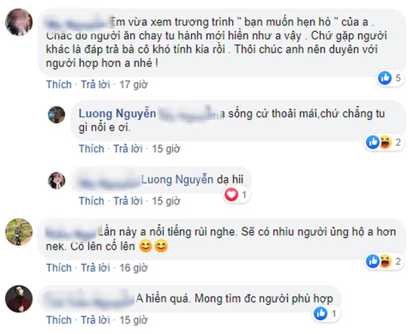 Một bạn nữa vào bình luận: "Em vừa xem trương trình 'Bạn muốn hẹn hò' của anh. Chắc do người ăn chay tu tập mới hiền như anh vậy. Chứ gặp người khác là đáp trả bà cô khó tính kia rồi. Thôi chúc anh nên duyên với người hợp hơn anh nhé!".