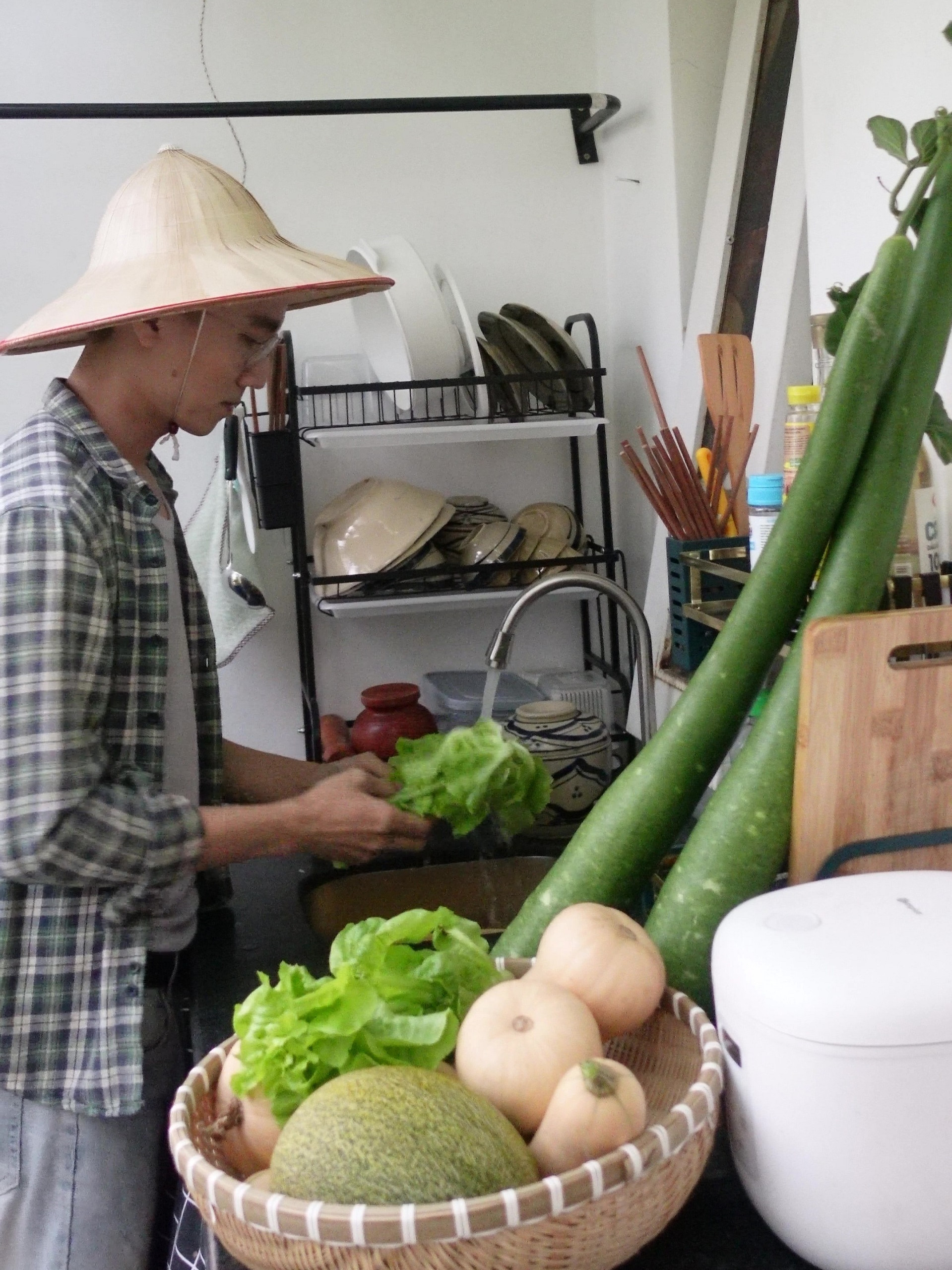 "Dưới giàn bầu, bí, tôi hay ngồi ăn tối, ngồi vẽ những công trình cho khách hàng hay xem các chương trình trên máy chiếu. Gió thổi rất mát mẻ và thoáng đãng", anh nói.