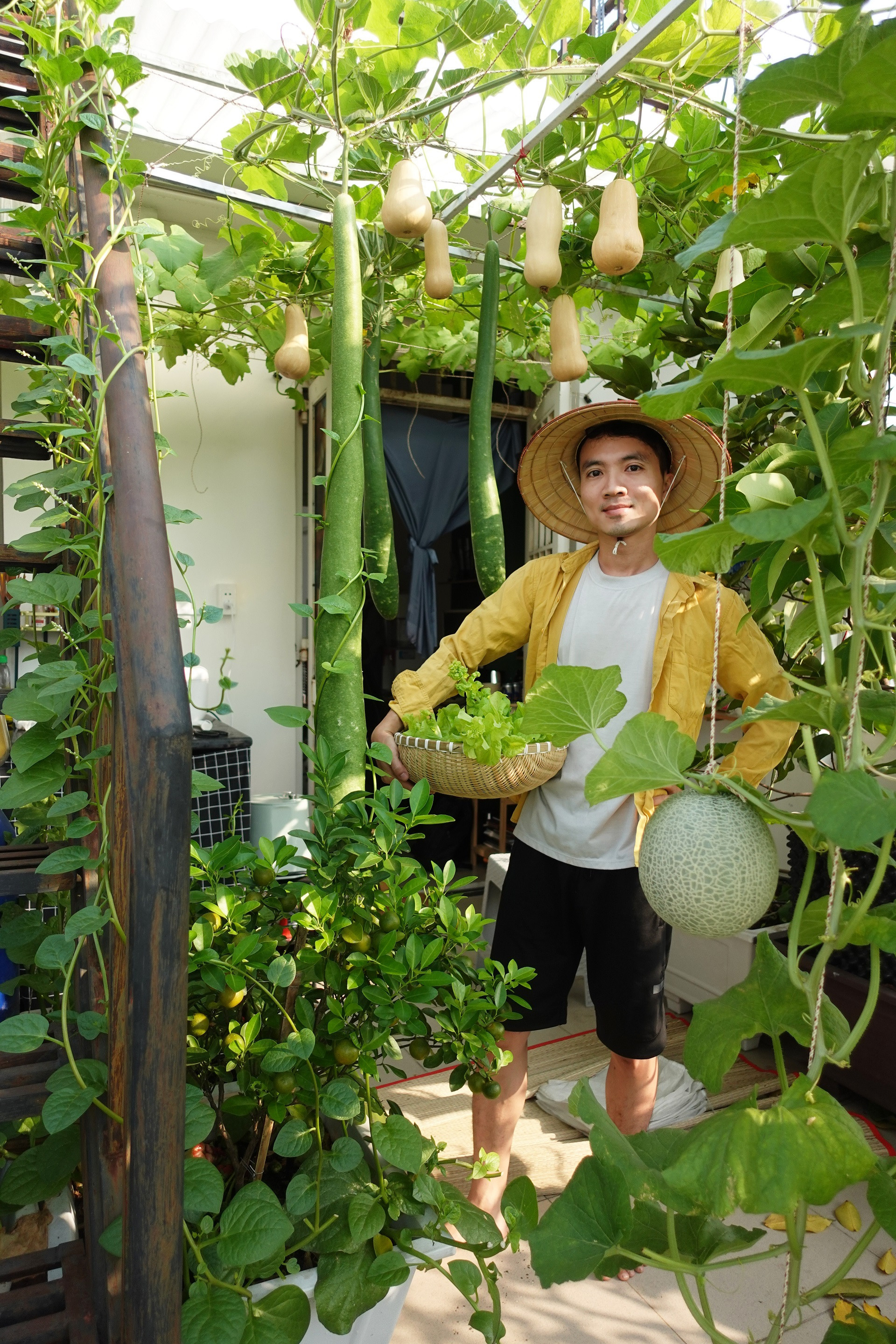 Anh Nguyễn Đức Trí (SN 1994, quê ở Quảng Ngãi), hiện là kiến trúc sư, sống ở TPHCM. Yêu thích làm vườn, chăm cây và mong muốn nghiên cứu nhiều hơn về kiến trúc xanh, bền vững, anh Trí đã cải tạo, biến sân thượng tầng 6 nơi mình ở thành một "nông trại" xanh mướt, sum sê rau trái.