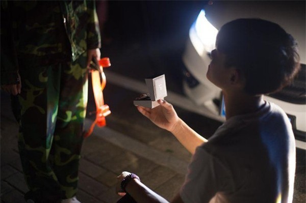 Cặp đôi đã hẹn hò nhau từ hồi còn học trung học, và hiện giờ đang là sinh viên năm nhất của một trường đại học ở Quảng Châu. Chính vì thế, địa điểm diễn ra màn cầu hôn chính là ở sân ký túc xá của trường cô gái. Chàng trai đã tạo hình những chiếc xe bên dưới ban công, sau đó mở nhạc và hú còi để cô gái ra ngoài. Những tưởng mọi chuyện sẽ làm đối tượng bất ngờ nhưng cô gái từ từ đi xuống và không tỏ ra ngạc nhiên chút nào khi được bạn trai rút nhẫn ra cầu hôn. Nhưng bù lại, cô gái gật đầu đồng ý trong hạnh phúc.
