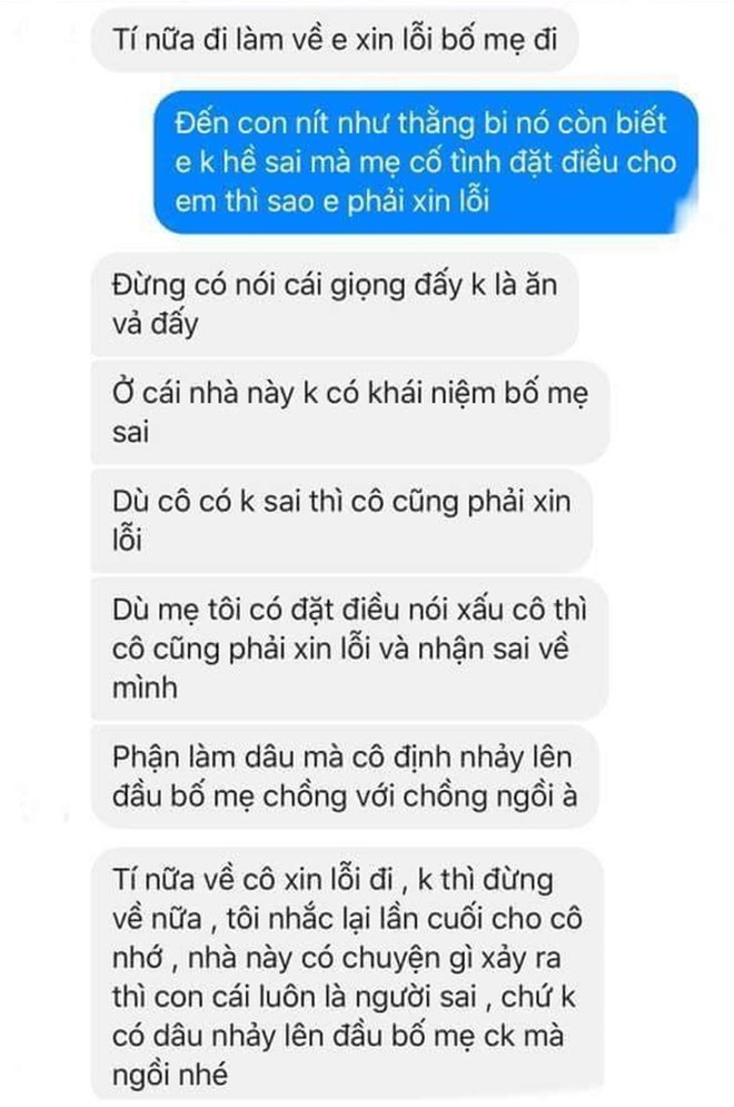Có vẻ như nàng dâu trẻ này đang có chút mâu thuẫn với mẹ chồng và cô cho rằng mọi chuyện là do mẹ chồng cố tình đặt điều chứ cô không hề sai nên không muốn xin lỗi.