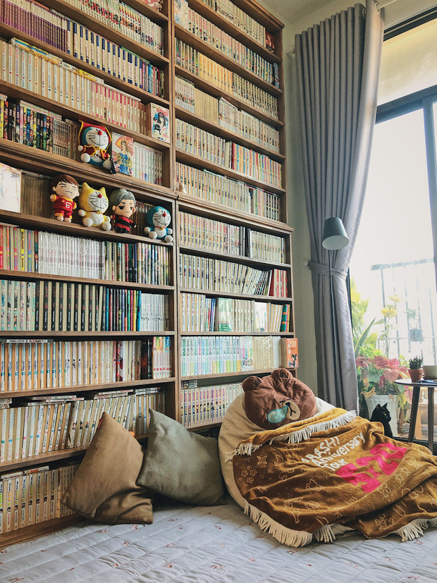 Trong nhà, mình cũng rất thích khu vực phòng khách. Ở đây mình có một tủ sách lớn đựng hơn 2000 cuốn truyện tranh và cả nghìn quyển tiểu thuyết. Mình còn đầu tư một chiếc tivi 55inch để xem phim nên ở phòng khách sẽ có đủ mọi thứ để giải trí.