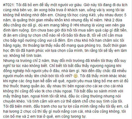 Nhưng ra trường chỉ 2 năm, thay đổi môi trường đã khiến tôi thay đổi suy nghĩ từ lúc nào không biết. Chỉ biết tôi bắt đầu thấy ngượng ngùng khi đồng nghiệp hỏi người yêu ở đâu, nhà làm gì. Nói đến đây chắc đã nhiều người muốn nhảy lên chửi bới tôi rồi nhỉ? Tôi đã thấy mình khác khác khi nghe các ông bạn kể dẫn về quê, người yêu mua tặng bố mẹ em út đủ thứ thuốc thang quần áo, lấy nhau thì bên ngoại cho cái xe cho cái nhà không thì cũng đổ vào tk cho cháu ngoại. Tôi bắt đầu so sánh mình với mấy thằng bạn, ngoại hình tôi rất khá, đầu óc cũng thường nhưng nói chuyện khéo. Và tình cảm với em cứ thế dành chỗ cho suy tính của tôi. Tôi đã biện minh, đấu tranh cho sự tư lợi của mình rằng nếu tôi lấy em, cả hai lương 2 chục củ thì lấy gì nuôi nấng con cái, nhà cửa cũng không, tôi còn bố mẹ và 2 em trai ở quê, em cũng tương tự. Chỗ làm của tôi có khá nhiều nữ và có một cô sống gần phòng trọ của tôi. Vài lần trời lạnh cô đi taxi đi làm, lúc về tắc đường nên tôi đề nghị đưa về nhà. Cô khá xinh và ra dáng tiểu thư, nói chuyện nhẹ nhàng. Dần dần tôi và cô có inbox riêng, hẹn đi ăn trưa. Có lần cô mời tôi vào nhà, tôi đã choáng ngợp lúc đó, gia đình cô giàu có quá sức tưởng tượng của tôi. Tôi đã trở nên dễ dãi và tán tỉnh cô ra mặt hơn trước. Được 5 tháng thì người yêu tôi phát hiện ra chuyện, em không nói một lời. Theo phản xạ thông thường, tôi vẫn lấy lí do giải thích là bạn cơ quan và xin lỗi em. Nhưng em chỉ đứng im nhìn tôi rồi đi về. Đêm hôm đó, em nhắn tin cho tôi: Em không có gì để nói, chúc anh hạnh phúc. Mọi chuyện kết thúc nhanh gọn nhẹ, như là mới yêu vài tuần. Tôi nghĩ em sẽ gào khóc oán trách tôi, nhưng chắc bây giờ em cũng không quá tha thiết. Tôi luôn tự suy diễn ra lí do để bào chữa cho sự hèn hạ của bản thân như vậy. Từ đó không ai liên lạc với ai nữa. Cô đồng nghiệp biết chuyện, chúng tôi thả phóng mọi thứ và điên cuồng yêu đương, cô có bầu. Và thế là chúng tôi tổ chức đám cưới. Bạn bè có đứa chửi, có đứa khen, gia đình tôi hết sức hài lòng vì cô con dâu mới. Tôi tự gạt đi lòng tự trọng và suy nghĩ bản thân là thằng đào mỏ rằng : Vợ tôi yêu tôi. Thế là đủ. Đến giờ, chúng tôi đã lấy nhau được 1 năm, chúng tôi sống ở chung cư cao cấp nhà ngoại mua, lái xe của vợ vì vợ tôi không biết lái. Tôi bỏ việc chỗ cũ, cun cút về làm cho bố vợ. Mỗi tháng tôi gửi được 5tr về cho bố mẹ. Mọi chuyện vẫn hằng ngày tiếp diễn nếu như tôi không gặp lại em. Hôm ấy tôi đang trong siêu thị thì chạm mặt em, em gầy hốc hác, em vẫn nhìn tôi cái nhìn của ngày cuối cùng rồi nước mắt cứ thế tuôn ra không thành tiếng. Tôi định ôm lấy em nhưng em đã chạy đi, ừ tôi làm gì còn tư cách gì. Sau hôm ấy tôi có nói chuyện lại với bạn thân của em thì mới biết em sau chia tay em đã khổ sở thế nào. Tôi sẽ không kể thêm ra đây làm gì nữa, vì sự dằn vặt hằng ngày đã đủ lắm rồi. Khi có tình cảm, thì tôi vứt bỏ chạy theo tiền. Khi có tiền rồi, nhưng chỉ là do sự tính toán đơn kép của mình, tôi lại thấy nhục nhã hơn bao giờ hết. Thì ra ngưu tầm ngưu mã tầm mã, đi làm chỗ bố vợ mọi người nhìn tôi bằng con mắt khác. Những cánh dựa hơi vợ chơi với nhau và những ông tự lập chơi với nhau. Thì ra tôi chẳng yêu vợ tôi, tôi chỉ yêu tiền và vẻ bề ngoài của cô ấy mà thôi. Thì ra người yêu tôi đã cam chịu đau khổ mà kiên quyết không than trách nửa lời với tôi. Giờ tôi mới tỉnh ra thì cũng muộn. Giờ này tôi chỉ mong em sẽ sớm tìm được người chồng tử tế và sống hạnh phúc hơn trong quãng đời còn lại. Anh xin lỗi, NL!. |