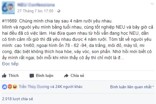 Xin trích nguyên văn lời tâm sự của chàng trai: #11669: Chúng mình chia tay sau 4 năm rưỡi yêu nhau. Mình và người yêu mình bằng tuổi nhau, cùng tốt nghiệp NEU và bây giờ cả hai đều đã có việc làm. Hai đứa quen nhau từ hồi vẫn đang học NEU, dần có tình cảm rồi giờ thì đã yêu nhau được 4 năm rưỡi. Tóm tắt về người yêu mình: cao 1m60, ngoại hình ổn 78 - 62 -94, da trắng, môi đỏ, mày tỏ, mi cong, đặc biệt không thích hoa hòe, váy vóc, son phấn. Nhớ hồi mới biết cô ấy mình rất ngại, bởi mỗi khi nhìn thấy cô ấy thì chỉ một là đang cầm sách, hai là đang cầm điện thoại. Mình là chàng trai mạnh dạn duy nhất trong số rất nhiều chàng trai để ý cô ấy dám tiến tới. 5 tháng đầu tiên công cuộc bám đuôi của mình, mỗi khi mình nói gì cô ấy cũng chỉ cười, cười giượng gạo, cô ấy không hề nói chuyện với mình dù chỉ một từ trong suốt thời gian đó. Nhưng đúng là đẹp trai không bằng chai mặt. Mình và cô ấy chính thức yêu nhau sau hai năm theo đuổi.