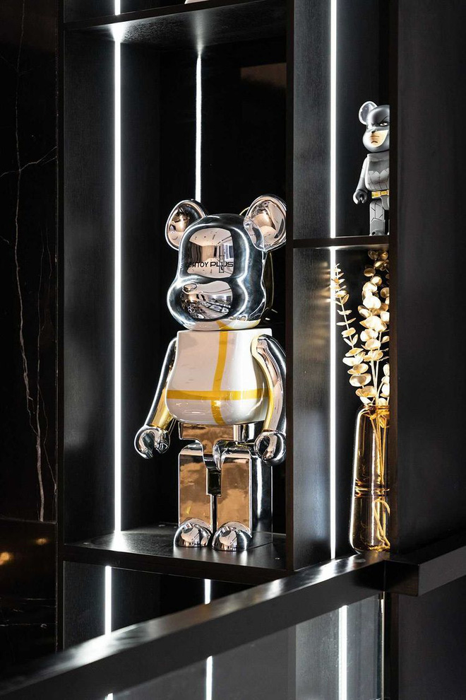 Ngoài ra, trong căn hộ cũng có nhiều góc bày bộ sưu tập decor mà anh sưu tầm được. Đặc biệt phải kể đến bộ sưu tập gấu Bearbrick khoảng hơn 10 con. Mỗi một con đều được chọn lựa kỹ càng để phù hợp với những góc art trong nhà. Giá trị của món đồ trưng bày này khoảng 100 triệu/món. Trong số đó, có 1 con anh Công Lee cất công tìm khá là lâu và cũng khá hiếm. Đây cũng là chú gấu Bearbrick đắt nhất vì nó sản xuất đã lâu nên giá bị đội lên khá cao. Để rinh được em nó về, anh đã chi 180 triệu.