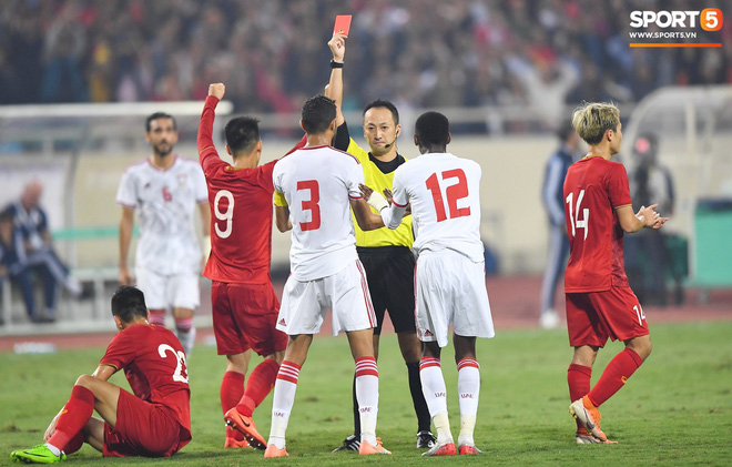 Ngay lập tức, trọng tài chính rút ra chiếc thẻ đỏ cho cầu thủ này. Việt Nam được hưởng lợi thế rất lớn khi UAE chỉ còn chơi với 10 người.