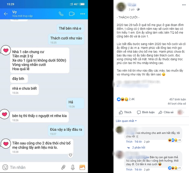 Thách cưới nhà gái yêu cầu 1 nhà chung cư, tiền mặt 3 tỷ, 1 xe ô tô, vòng vàng nhẫn cưới cùng hoa quả sính lễ, - câu chuyện mà facebook D.Q đăng tải trên diễn đàn đông thành viên mới đây đã khiến dân mạng xôn xao bàn tán.