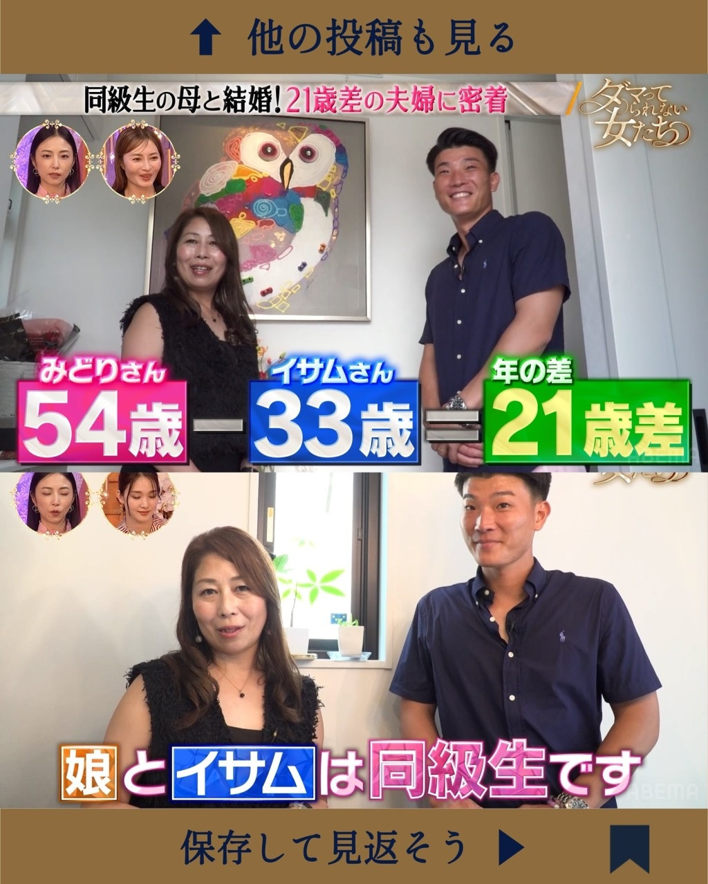 "Khi mới 10 tuổi và vẫn còn là một cậu học sinh tiểu học, tôi đã thấy Midori lần đầu tiên khi cô ấy tới trường họp phụ huynh cho con gái, cũng là bạn cùng lớp với tôi. Cho tới giờ, tôi vẫn không thể quên được khoảnh khắc để lại những cảm mến ban đầu đầy thơ ngây ấy", anh Isamu kể lại trên chương trình.