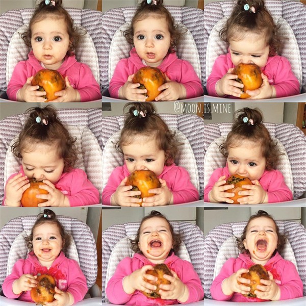 Loại trái cây yêu thích là quả hồng, nên cô bé cười như được mùa khi cầm hẳn một quả thật lớn trong tay và tha hồ đánh chén.