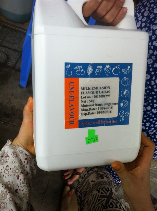 Vậy là ngoài đậu nành, công nghệ chế biến nước đậu “nguyên chất” còn có thêm bột béo và hương liệu để tạo mùi. Khi chúng tôi ngỏ ý muốn mua, nhân viên giới thiệu ngay 1 kg bột béo giá 80.000 đồng, 1 lít hương tạo mùi giá 400.000 đồng.