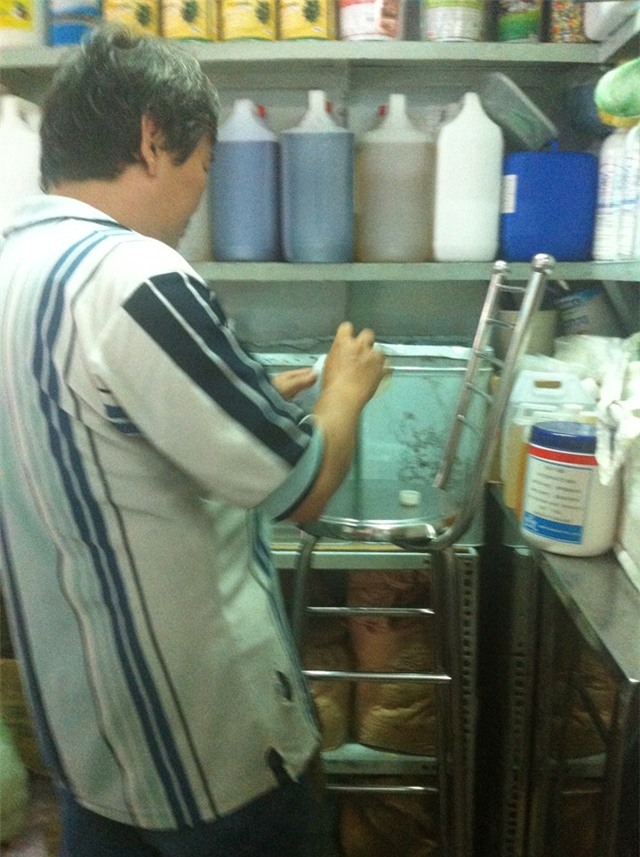 Tại cửa hàng M.H, các chất tạo mùi được bày ngay mặt tiền. Nhân viên báo giá bột tạo mùi 400.000 đồng/kg, chất tạo hương liệu 180.000-300.000 đồng/lít, tùy loại hương. Người này cho biết thêm, lượng pha thì tùy nhưng thường tỷ lệ là 10:0,3 tức là 10 kg cà phê (có pha thêm bột bắp hay bột đậu nành cho giảm nồng độ cafein) pha với 0,3 kg bột tạo mùi.