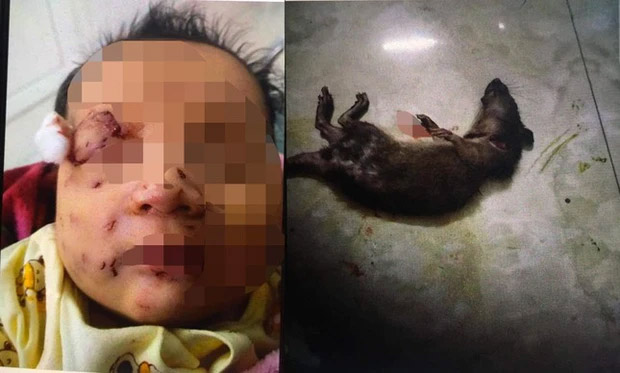 Hình ảnh cháu bé cùng con chuột được một số người chia sẻ lên mạng xã hội để cảnh báo gia đình có con nhỏ cần chú ý để tránh không xảy ra trường hợp tương tự. Trong ảnh trái, cháu bé bị nhiều vết thương ở vùng mắt, mặt.
