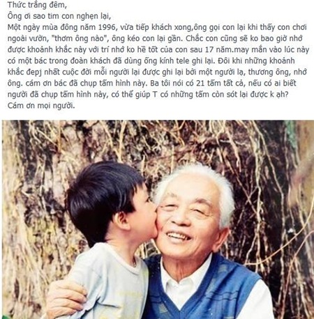 Anh viết: "Ông ơi, sao tim con nghẹn lại. Một ngày mùa đông năm 1996, vừa tiếp khách xong, ông gọi con lại khi thấy con chơi ngoài vườn, "thơm ông nào", ông kéo con lại gần hơn.