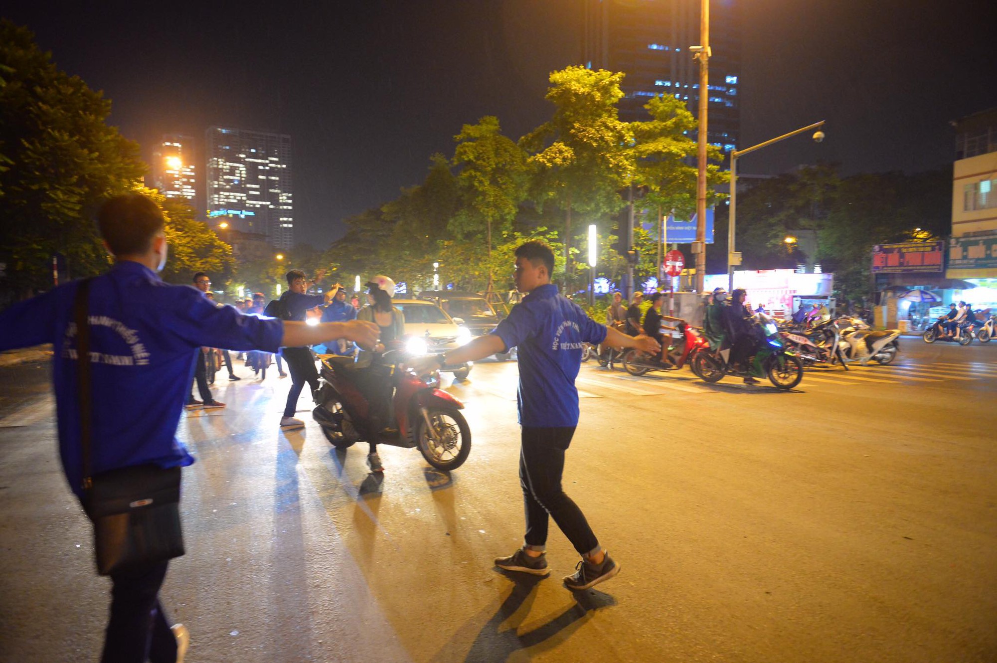Sinh viên tình nguyện hướng dẫn giao thông ở ngã tư Nguyễn Chí Thanh giao La Thành - Ảnh: Phương Thảo