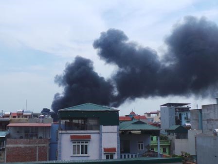 Ngọn lửa bùng lên lúc 12h30 ngày 26/6, gặp "chất xúc tác" là lượng lớn nhựa phế thải nên càng bùng phát nhanh, khói đen đặc quánh bốc cao hàng chục mét...