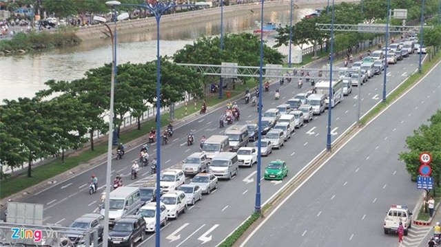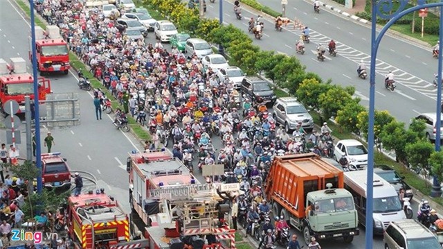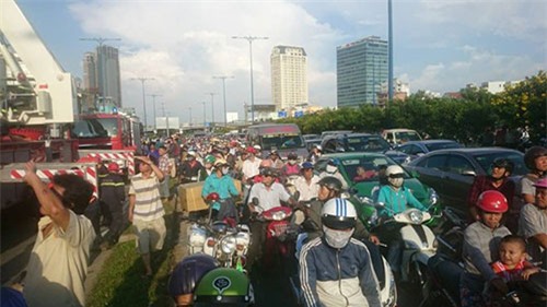 Đến 17h, đám cháy vẫn còn nghi ngút khói. Các con đường xung quanh bị phong tỏa nên xảy ra ùn ứ nghiêm trọng. Hàng nghìn ôtô nối đuôi nhau trên đại lộ Võ Văn Kiệt.