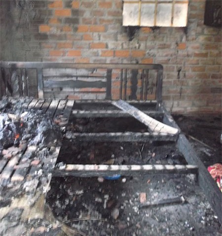 Chiếc giường ngủ của vợ chồng anh Thắng bị cháy |