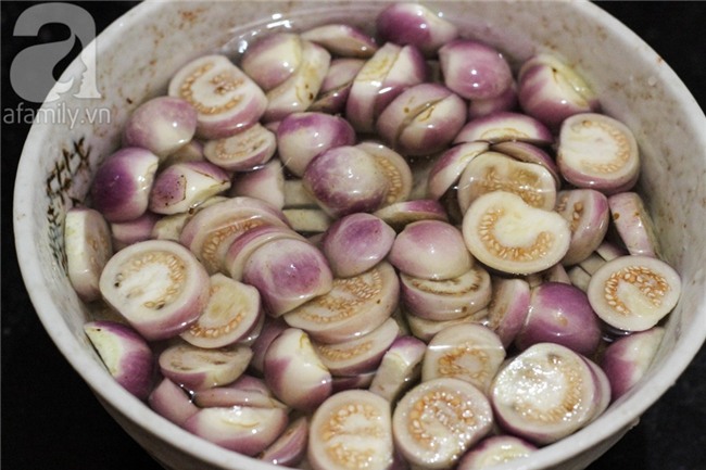 Cà cắt bỏ cuống, cắt đến đâu bạn thả ngay cà đến đó vào nước muối để cà không bị thâm. Cắt cà thành từng miếng mỏng, ngâm vào nước muối với dấm trắng khoảng 30 -45 phút để miếng cà trắng, không bị thâm đen.