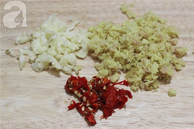 Riềng gọt vỏ, cắt miếng mỏng. Tỏi bóc vỏ. Ớt thái lát nhỏ.