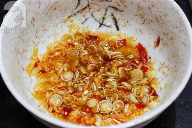 Cho 3 thìa nước mắm, 2 thìa đường, 1 thìa dấm, 1 thìa muối, nước quất vào bát to khuấy đều cho tan hết. Đổ sả, riềng, tỏi, ớt vào trộn đều.