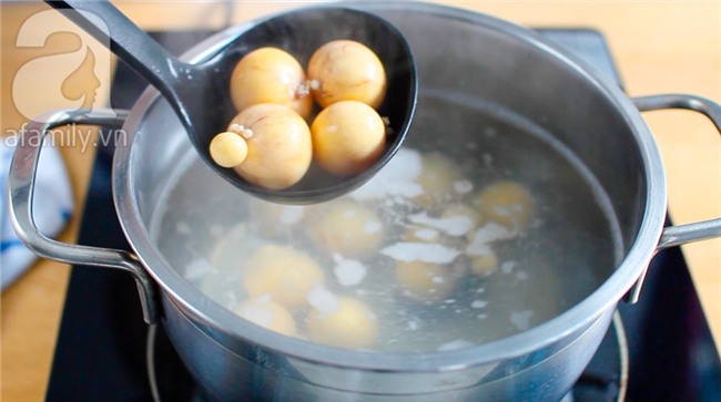 Luộc trứng non trong nồi nước sôi với tí muối. Khi trứng gần chín có màu vàng nhạt thì vớt ra.