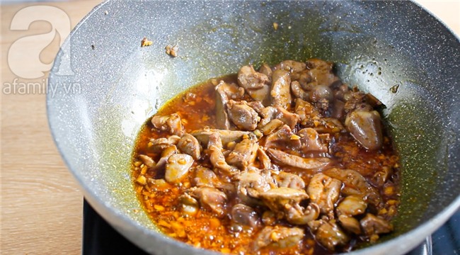 Cho ½ tỏi còn lại vào phi thơm, cho tiếp gan mề gà vào xào 2-3 phút đảo đều cho chín.