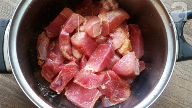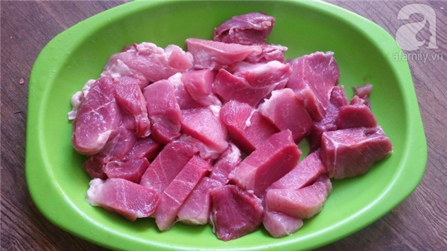 Thịt rửa sạch, ngâm với nước muối loãng khoảng 15 phút rồi vớt ra để ráo nước, thái miếng vuông.
