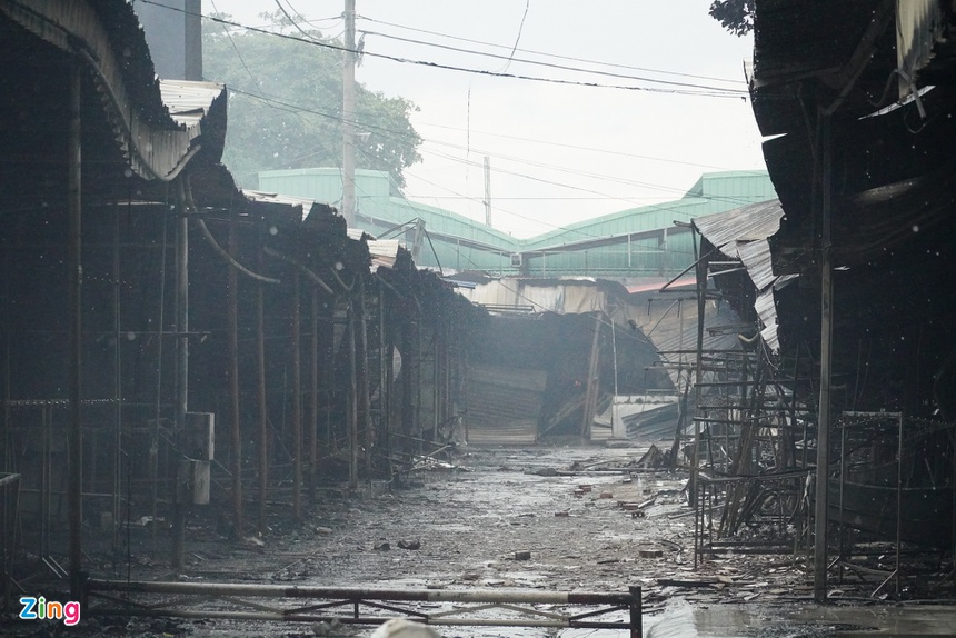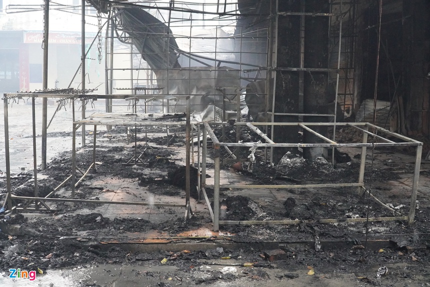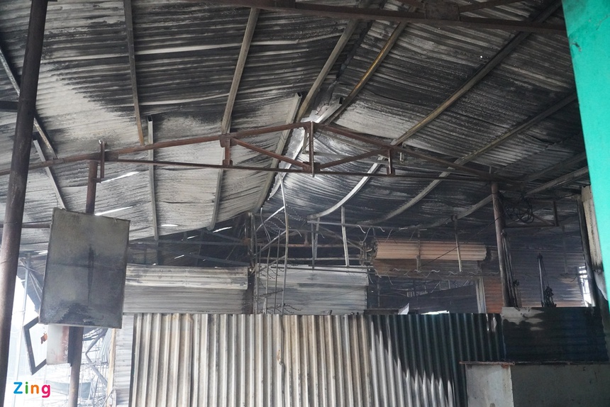 Các sạp hàng trong và ngoài khu nhà chợ đều bị cháy biến dạng, trơ khung thép.