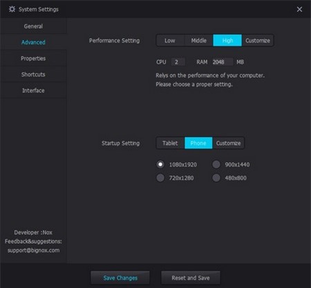 Cuối cùng, nhấn nút “Reset and Save” để khởi động lại phần mềm Nox App Player và các thiết lập có tác dụng.