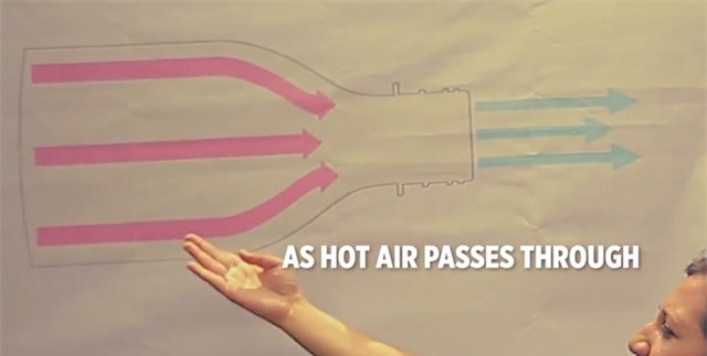 Tương tự như vậy, khi gió thổi qua vỏ chai, không khí sẽ bị cổ chai nén lại, và tạo ra những luồng gió có nhiệt độ thấp hơn.