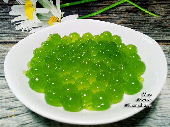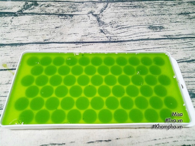 Bước 3: Pha nước cốt lá dứa với nước thạch, ta sẽ có nước thạch màu xanh trong. Đổ vào khuôn viên tròn, để nguội.