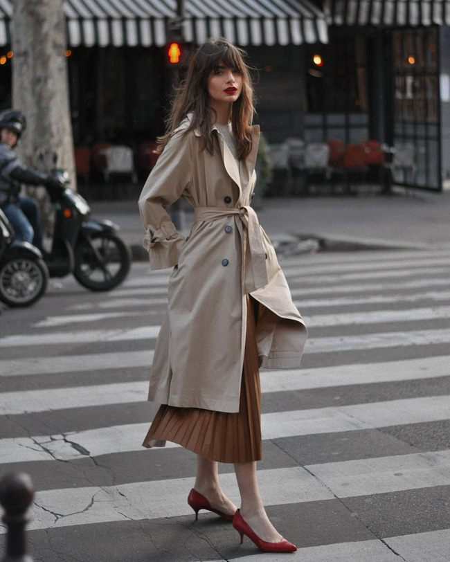 Cá chắc rằng giờ này, trong tủ đồ của các nàng sẽ có sẵn một chiếc áo trench coat mới sắm. Vậy thì hãy áp dụng ngay công thức diện đồ bao gồm áo len mỏng, chân váy xếp ly, khoác ngoài trench coat cực sang xịn mịn mà vẫn trẻ trung, sành điệu của cô nàng này.