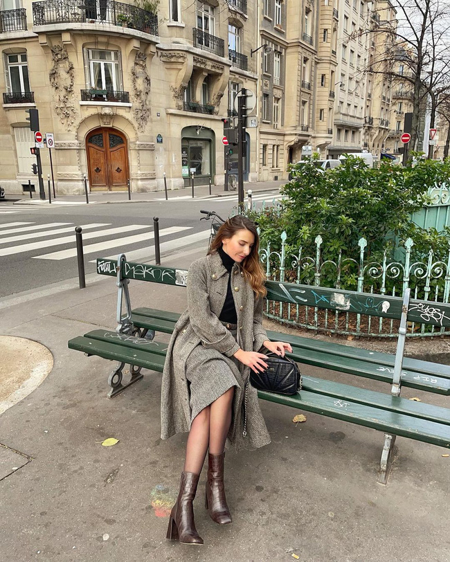 Diện combo áo khoác dáng dài + chân váy dài đồng bộ, quý cô này dường như không phải mix&match cầu kỳ, chỉ đơn giản là layer bên trong áo cổ lọ, đi boots thấp cổ cùng màu trung tính là vẻ ngoài đã trọn vẹn tinh tế, sang trọng.