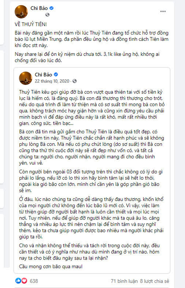 Chi Bảo chia sẻ lại bài viết của anh từ một năm trước, lên tiếng bày tỏ quan điểm về việc từ thiện của ca sĩ Thuỷ Tiên
