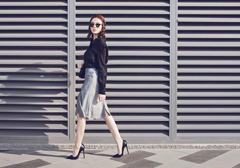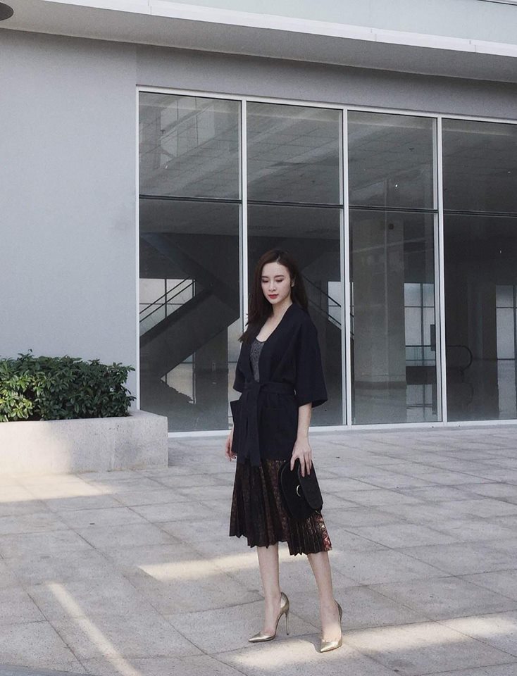 Một set đồ đậm chất công sở của Angela Phương Trinh với chân váy bút chì xẻ vạt kết hợp cùng sơ mi đen