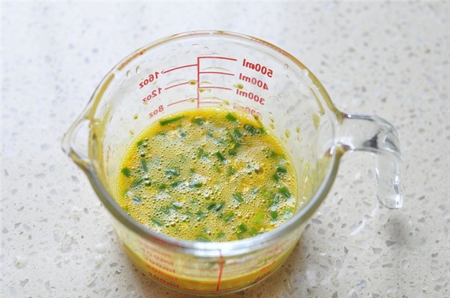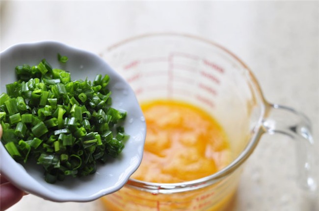 Hành lá mua về rửa sạch, để ráo rồi cắt nhuyễn. Sau đó cho vào trộn đều cùng với hỗn hợp trứng đánh tan cùng với muối.