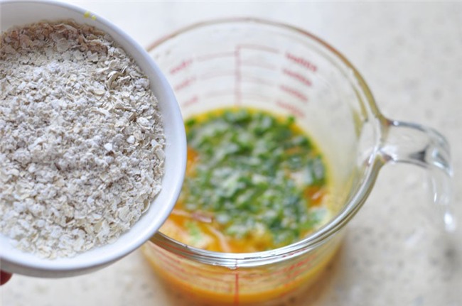 Tiếp đến cho bột yến mạch vào trộn cùng với hỗn hợp trứng.