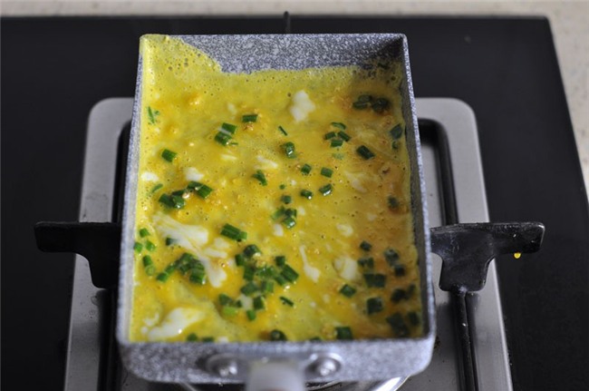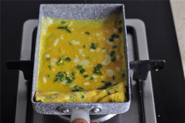 Khi dầu nóng đều thì bạn cho một lớp trứng vào chiên cho đến khi mặt tiếp xúc với chảo săn lại nhưng phần trứng vẫn còn hơi lỏng mềm thì cẩn thận cuộn trứng lại vào góc chảo.