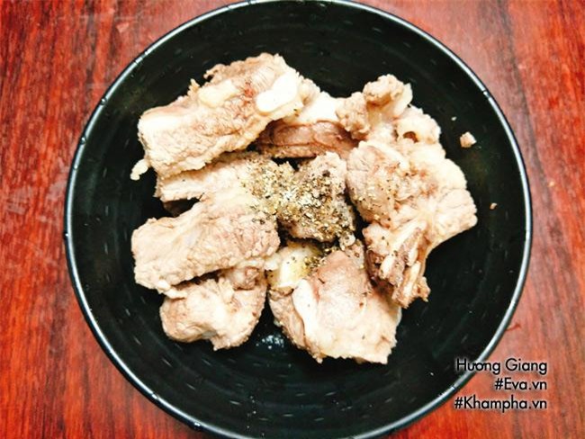 Bước 3: Cho sườn vào tô cùng với 1 chút muối, nước mắm, hạt nêm, tiêu sau đó đảo đều và ướp sườn 20 phút cho ngấm gia vị.