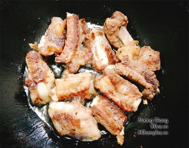 Bước 5: Đặt chảo lên bếp cùng với 2-3 thìa dầu đun cho dầu nóng, tiếp theo gắp sườn cho vào chiên sơ qua tới khi 2 mặt miếng sườn sém vàng thì vớt ra đĩa.