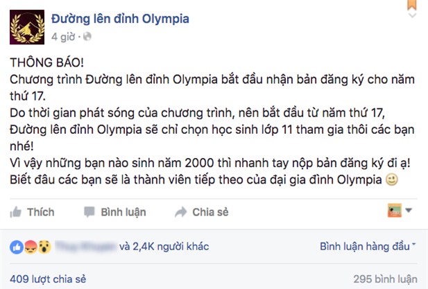 Theo như thông báo mới nhất này thì từ năm thứ 17, khi chỉ có học sinh lớp 11 được tham gia sẽ đồng nghĩa với các bạn sinh năm 1999 hoàn toàn không có cơ hội thi Olympia nữa. Cũng chính vì điều này mà phía dưới dòng status thông báo là rất nhiều bình luận tỏ ý không đồng tình và mong chương trình nên xem xét lại.