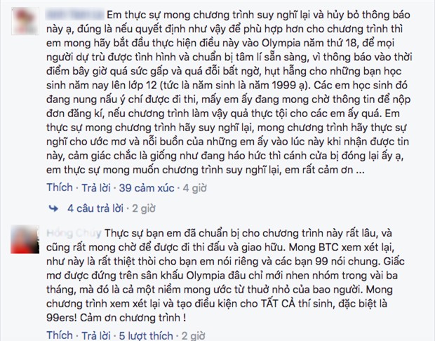 Rất nhiều bạn 99-er khác cũng thể hiện sự bất ngờ và cho rằng điều này rất thiệt thòi. Trong lúc các bạn ấp ủ suốt bao nhiêu lâu, chờ tới lúc đăng ký tham gia Olympia thì vì quy định mới mà không thể thực hiện ước muốn đấy của mình.