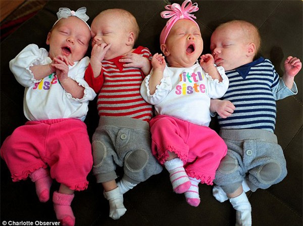 Thông thường các cặp song sinh giống hệt nhau được tạo ra khi một trứng đã thụ tinh chia làm hai phôi, và chỉ có khoảng 2% các ca mang thai xảy ra trường hợp này. Do đó mà tỷ lệ hai cặp song sinh được thụ thai cùng một lúc lại càng hiếm gặp hơn.