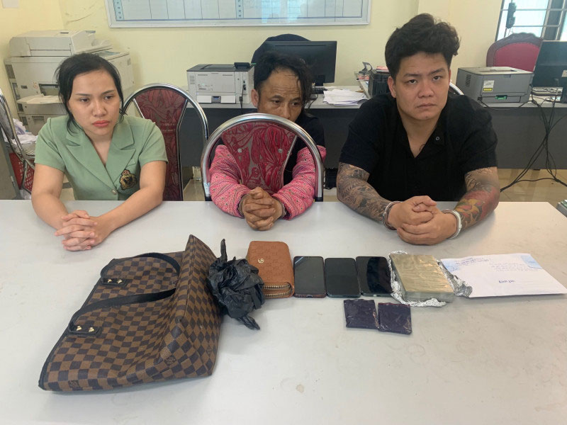 3 đối tượng Hồ Thị Loan, Giàng A Của, Tạ Quốc Cường (từ trái qua phải) cùng tang vật. Ảnh: CACC