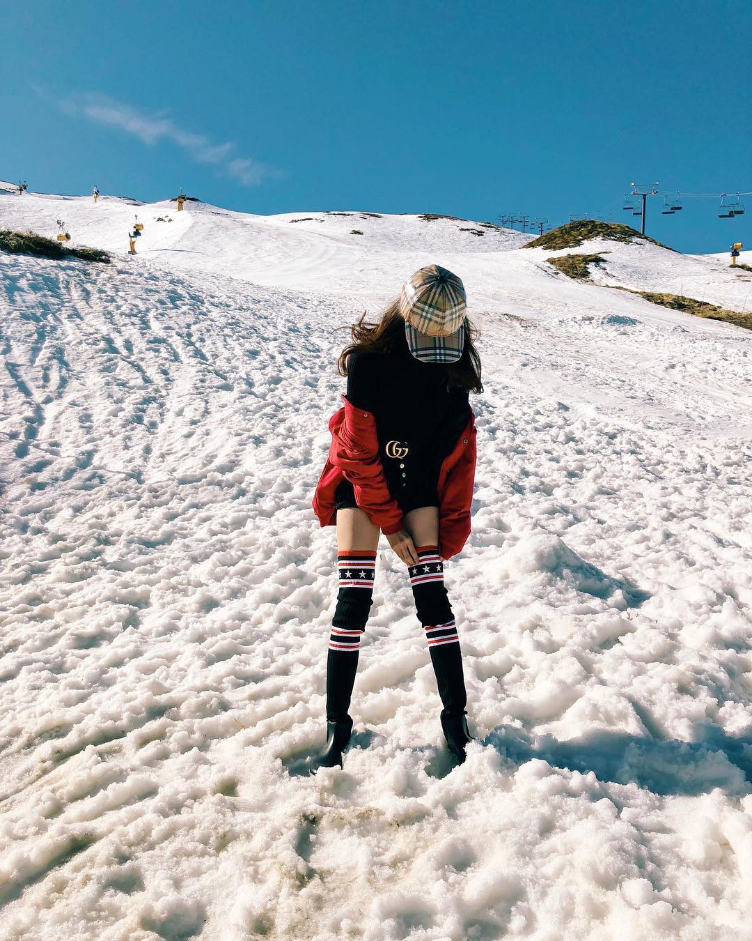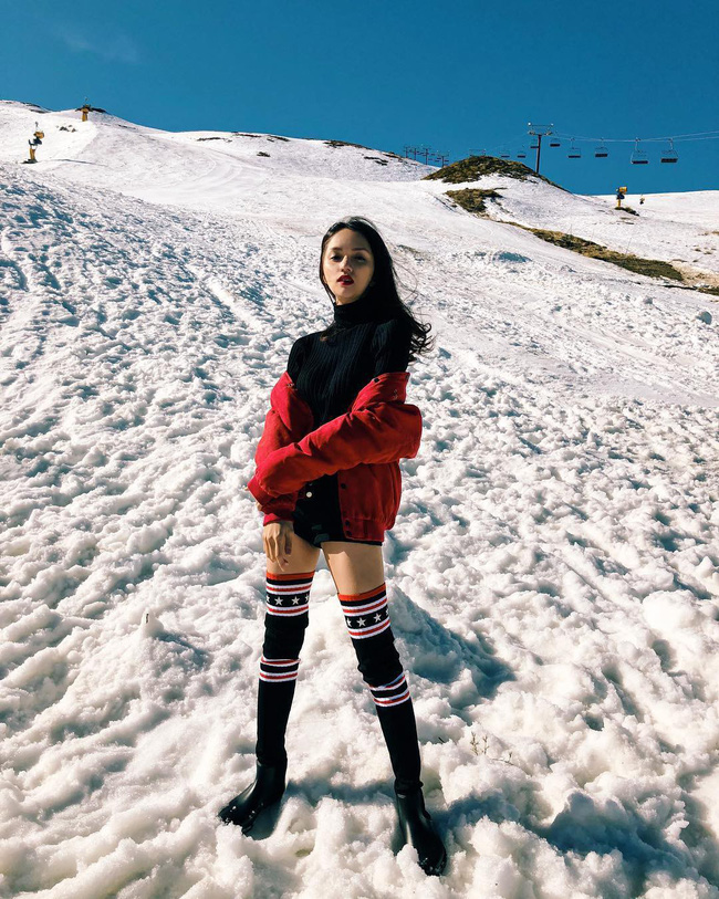 Trong chuyến đi du lịch nước ngoài mới đây, giữa khung cảnh núi tuyết bao la, Hương Giang như sáng rực cả 1 góc trời khi áo khoác đỏ nổi bật.