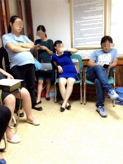 Dù được y tá mời ra ngoài nhưng một lúc sau cánh đàn ông lại kéo đầy vào bên trong phòng khám chiếm hết chỗ của bà bầu.